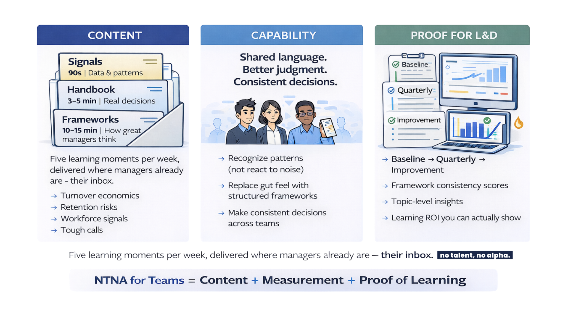 No Talent, No Alpha for Teams takes the best-in-class leadership content thousands of managers already read, and wraps it in a lightweight measurement system that lets L&D prove learning actually happened.