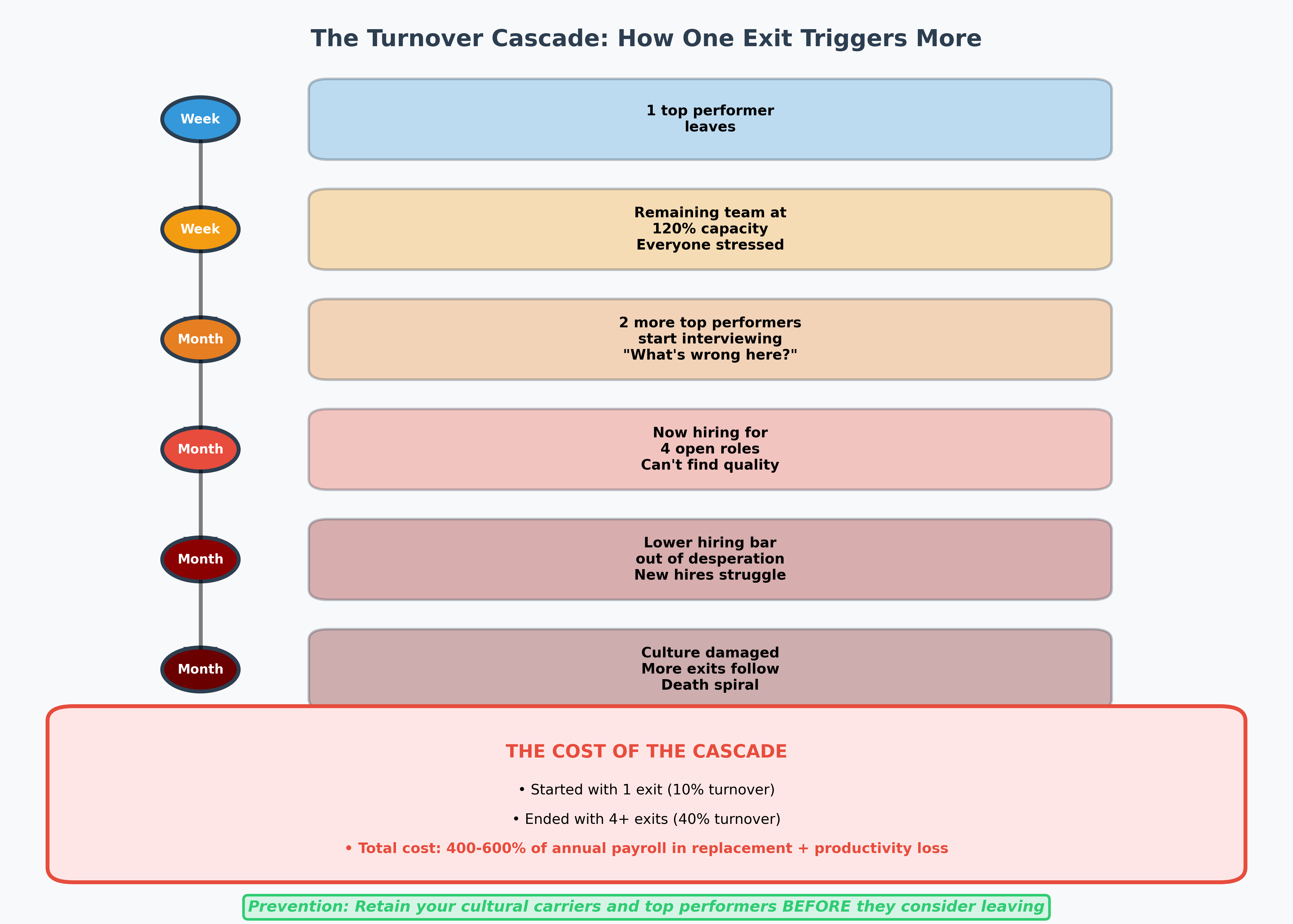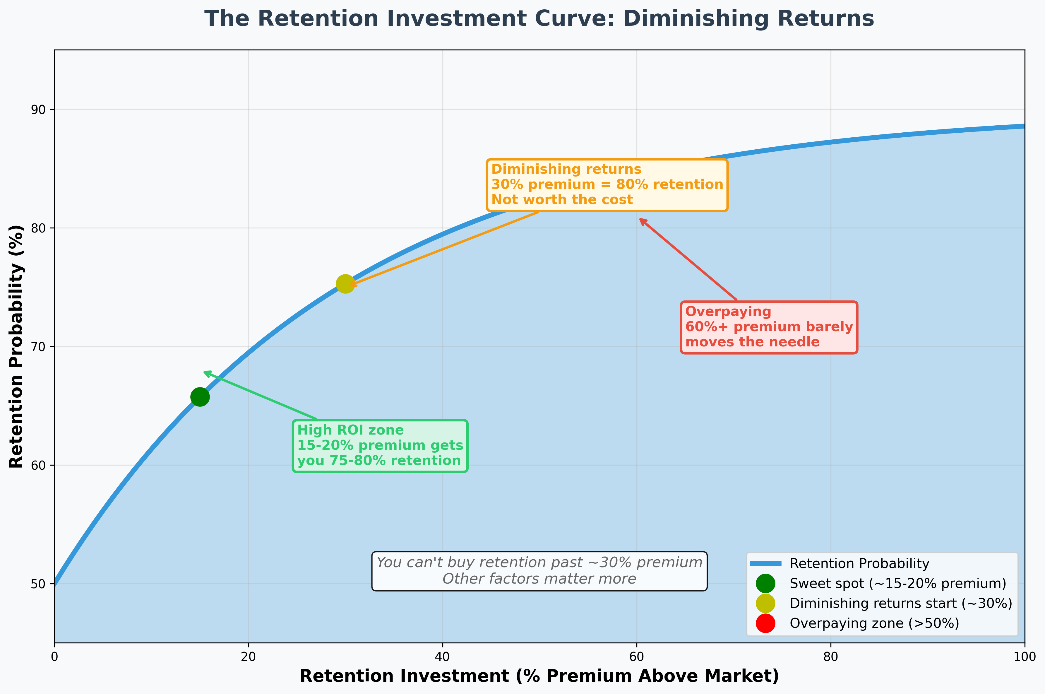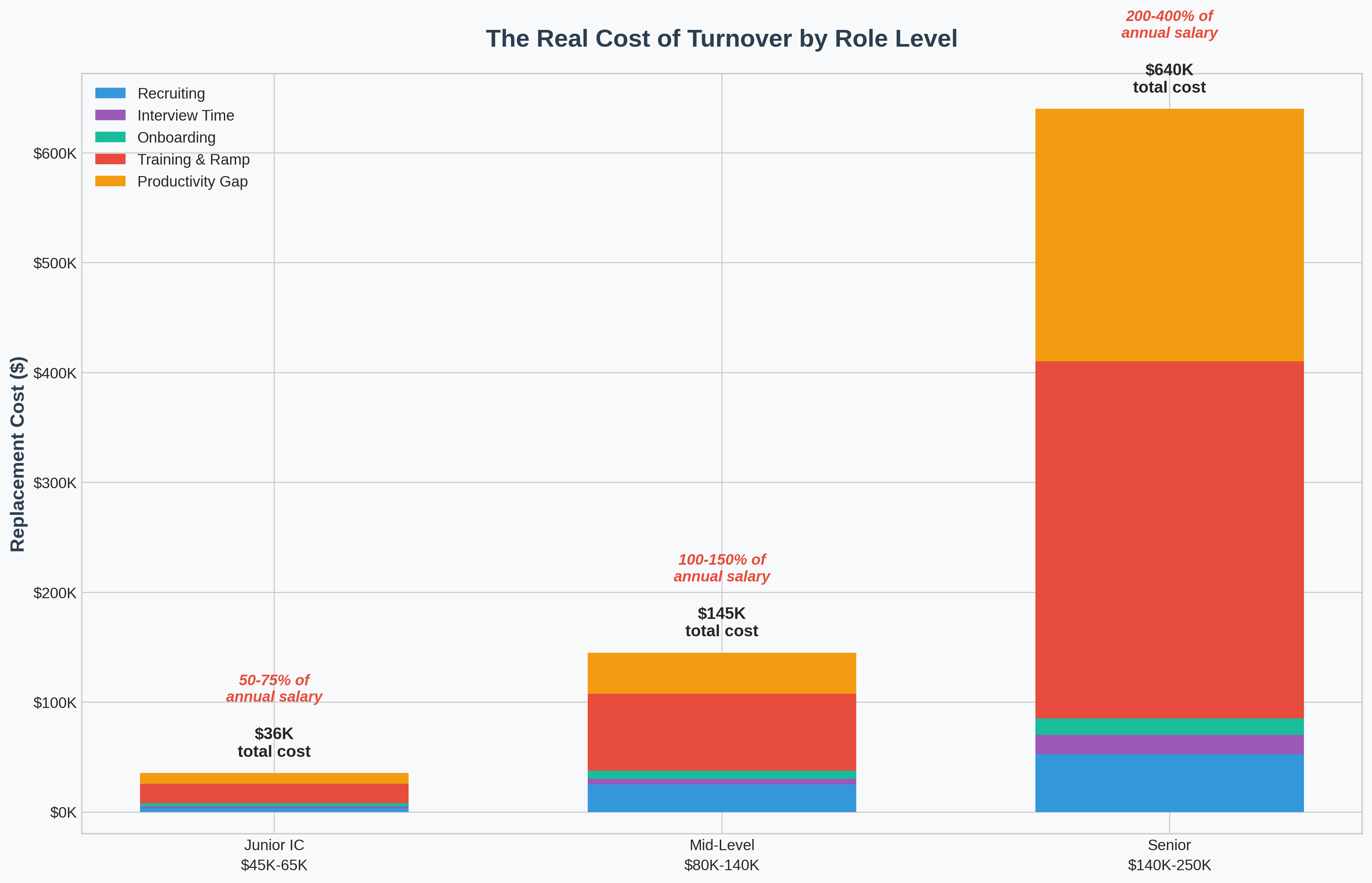 These aren’t small numbers. A $100K mid-level employee who leaves costs you $100K-150K to replace. A $150K senior person costs $300K-600K when you add up all the components. This is why the instinct to “do whatever it takes to keep them” often makes sense - replacement is genuinely expensive.